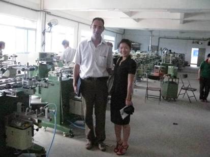 来自阿尔及利亚的穆斯林客人Mr. Achour Mezouari 于2008年7年来我公司参观丝印机,作为工程师和硕士生出身的他对机器比较内行,简单查看了我们的机器后他决定购买2台HC-SC-68曲面丝印机用来印刷装洗涤用品的PP塑料瓶。